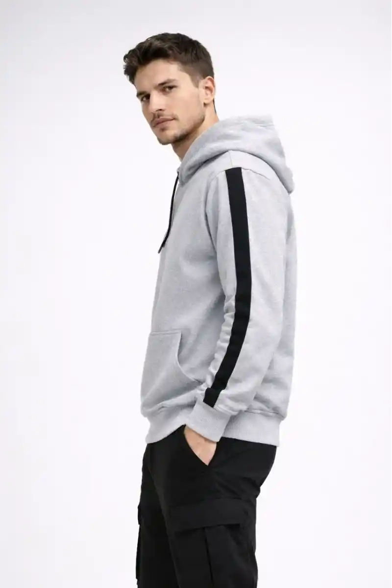 Erkek Şeritli Kapüşonlu Sweatshirt Oversize 3 iplik Pamuklu - Beyaz