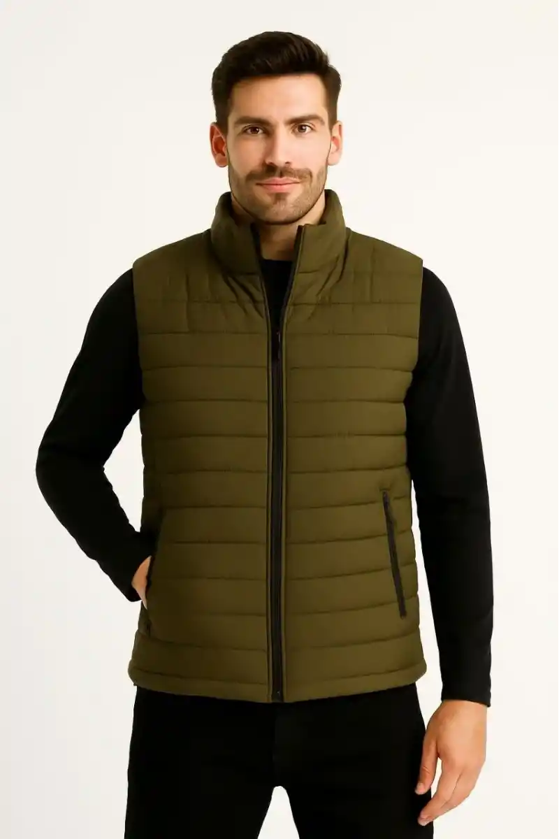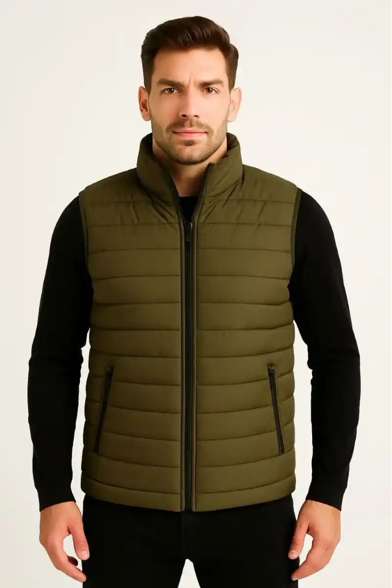 Erkek Şişme Fermuarlı Yelek Su itici Kapitone Astarlı Kumaş Cepli Hafif Kışlık Spor Rahat Kalıp - Haki