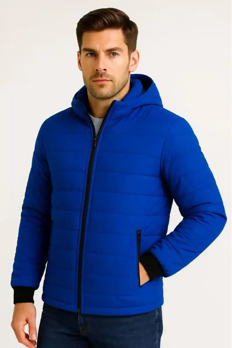 Erkek Şişme Kapüşonlu Fermuarlı Mont Su itici Kapitone Astarlı Kumaş Cepli Kışlık Rahat Kalıp - Saks Mavisi