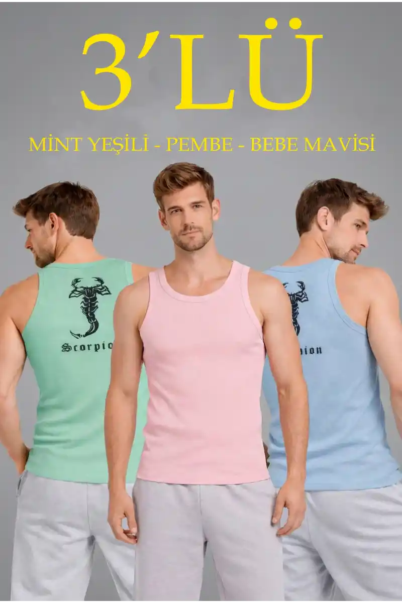 Erkek Spor Fitilli Atlet 3'lü Set Mint Yeşili Pembe Bebek Mavisi Slim Fit Kaşkorse Arka