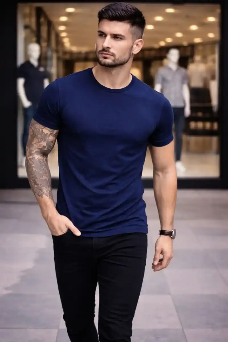 Erkek T-Shirt Bisiklet Yaka Slim Fit dar kesim Likralı Tişört Günlük Basic Body - Lacivert