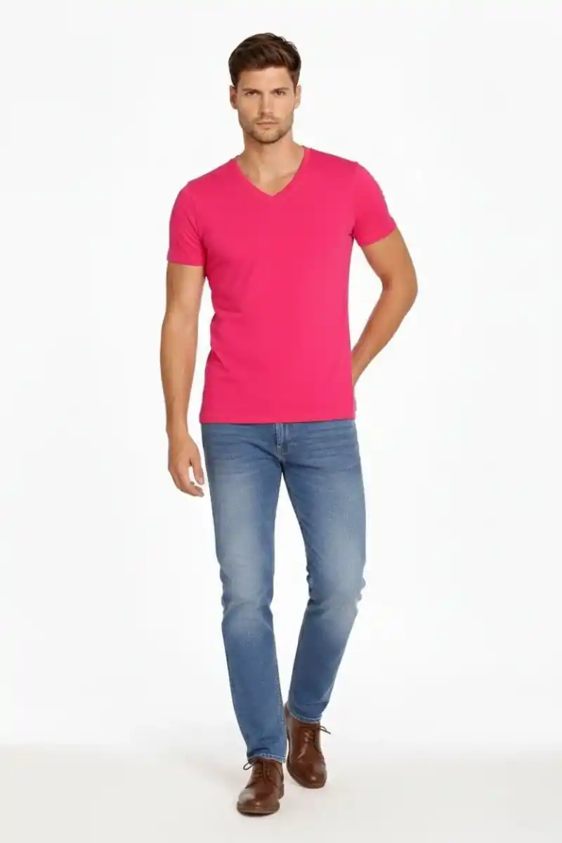 Erkek V Yaka Slim Fit dar kesim Likralı Tişört - Pembe