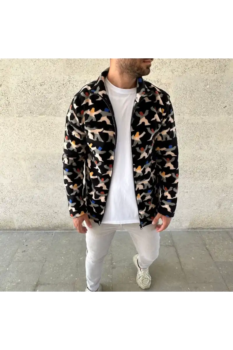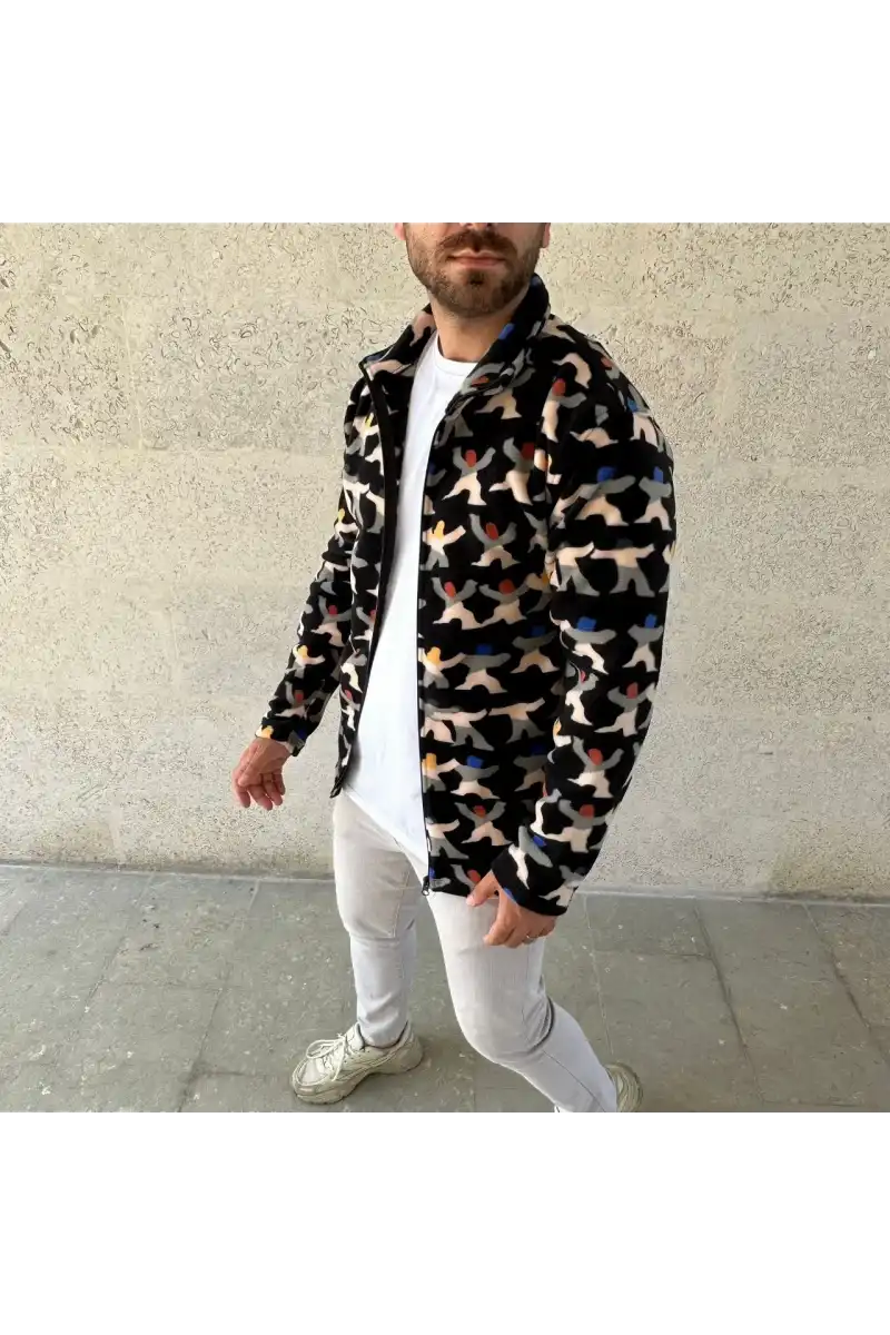 Erkek Tam Fermuarlı Desenli Polar Sweat – Siyah Multicolor Figür Desen Yakalı, Uzun Kollu, Oversize Rahat Kalıp- Siyah