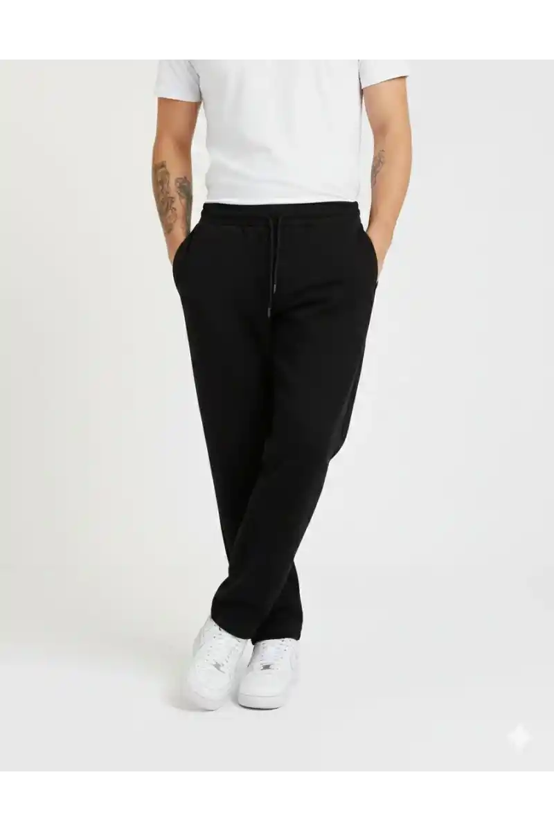 Erkek Üç iplik Kışlık Pamuklu Ovarsize Bağcıklı Düz Paça Cepli Eşofman Altı Spor Rahat Model - Siyah