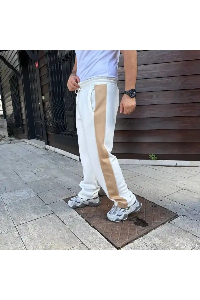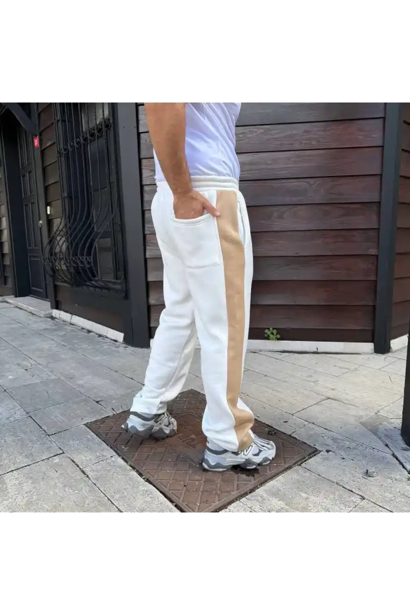 Erkek Üç İplik Kışlık Pamuklu Yandan Garneli Kalın Bej Şeritli Cepli Eşofman Altı - Beyaz