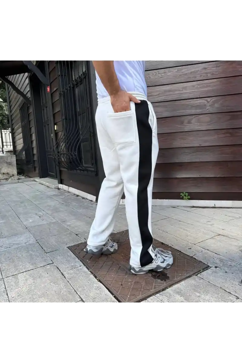 Erkek Üç İplik Kışlık Pamuklu Yandan Garneli Kalın Şeritli Cepli Eşofman Altı - Beyaz