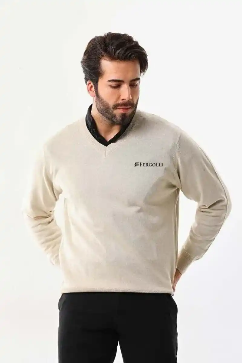 Erkek V Yaka Kazak Baskılı Dokuma Triko - Bej