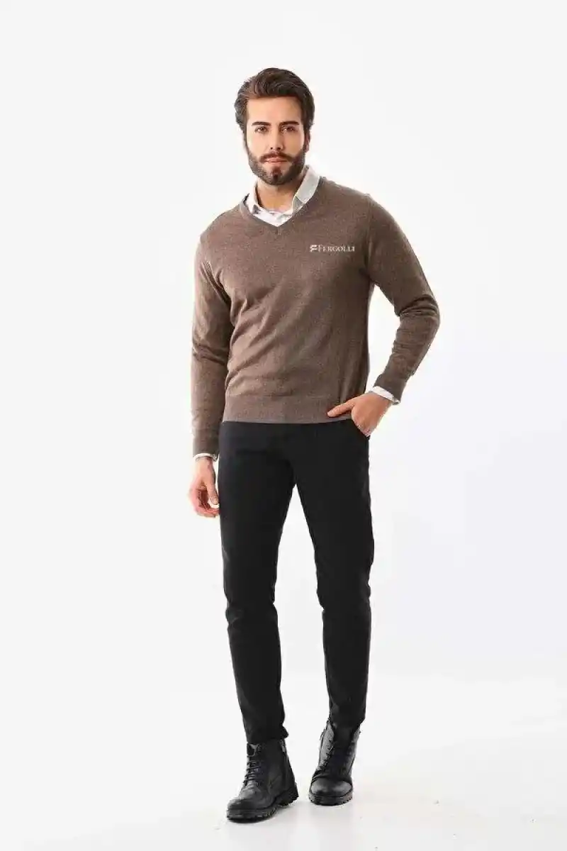 Erkek V Yaka Kazak Baskılı Dokuma Triko - Kahve