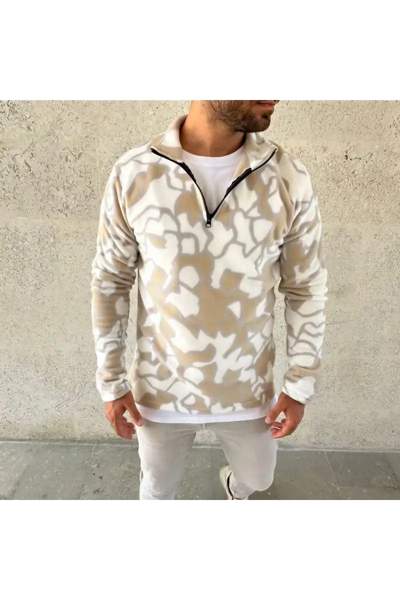 Erkek Yarım Fermuarlı Desenli Polar Sweat Yakalı, Uzun Kollu, Oversize Rahat Kalıp - Bej