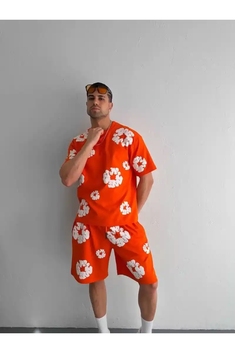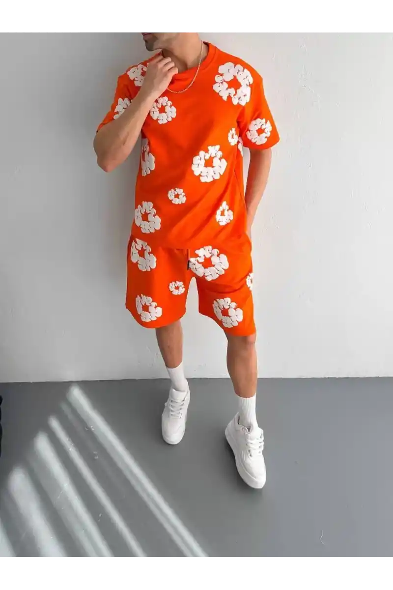 İki İplik Kumaş Baskılı T-shirt Şortlu Takım- Turuncu