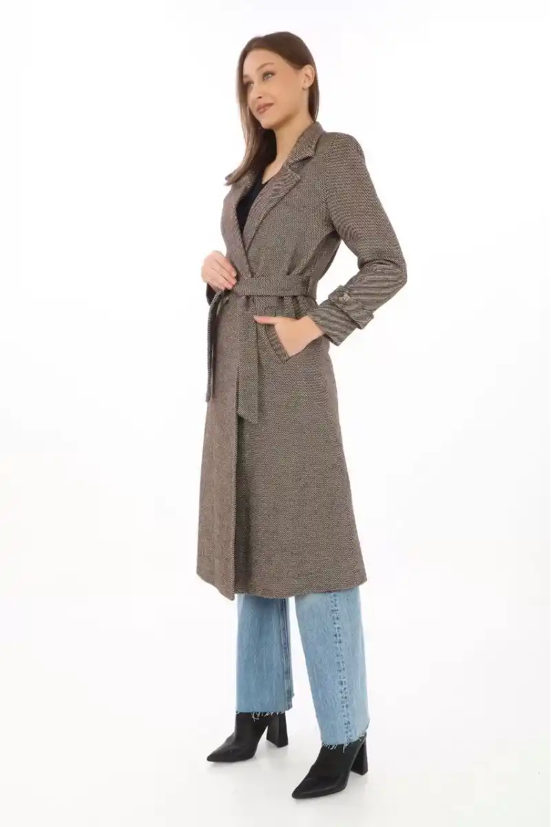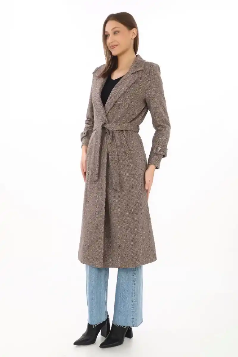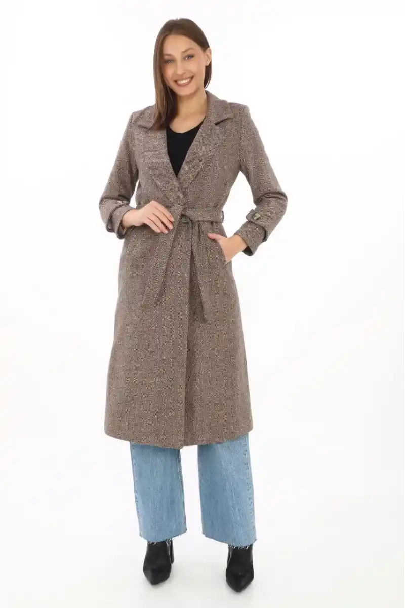 Kadın Astarlı Balık Sırtı Kaşmir Kaşe Kaban - Vizon