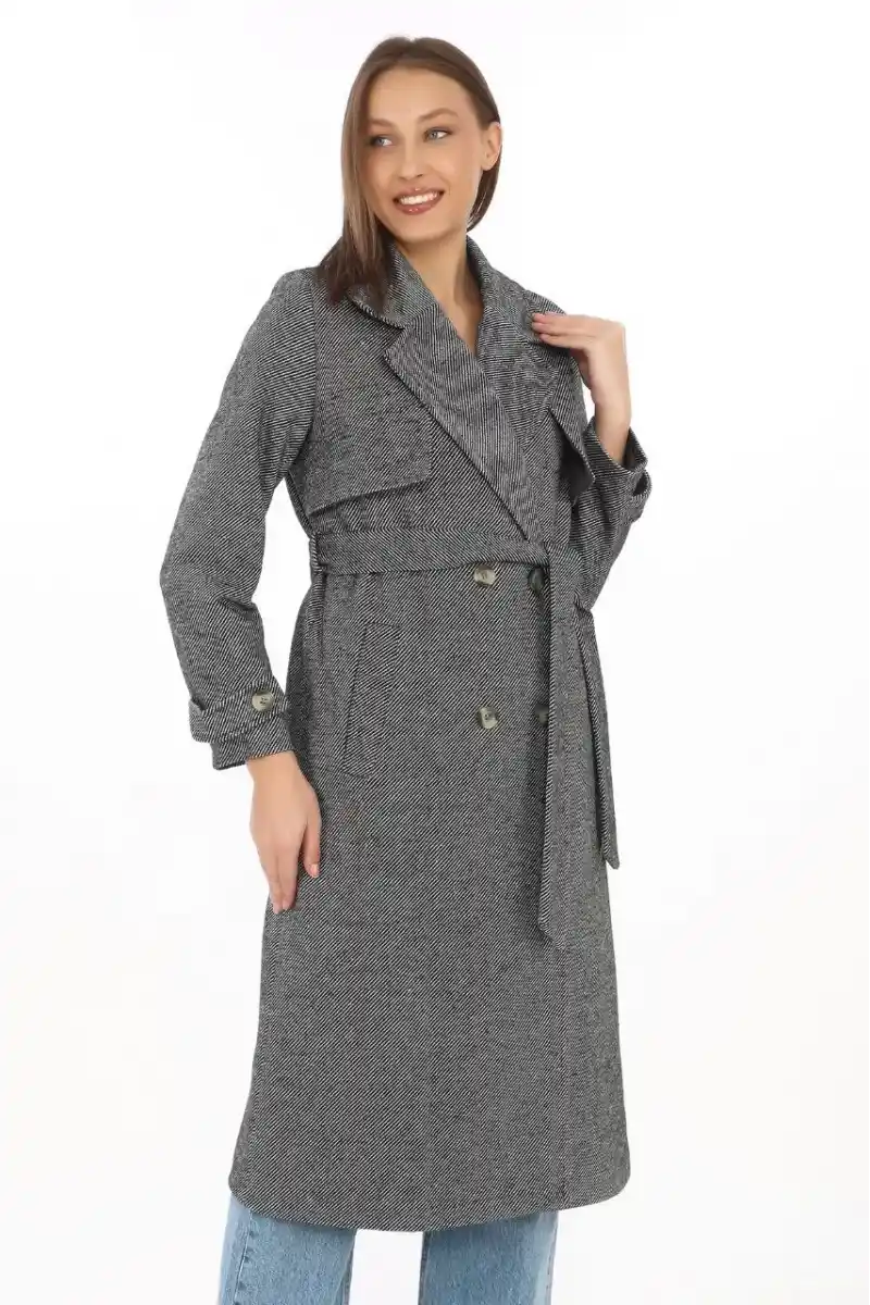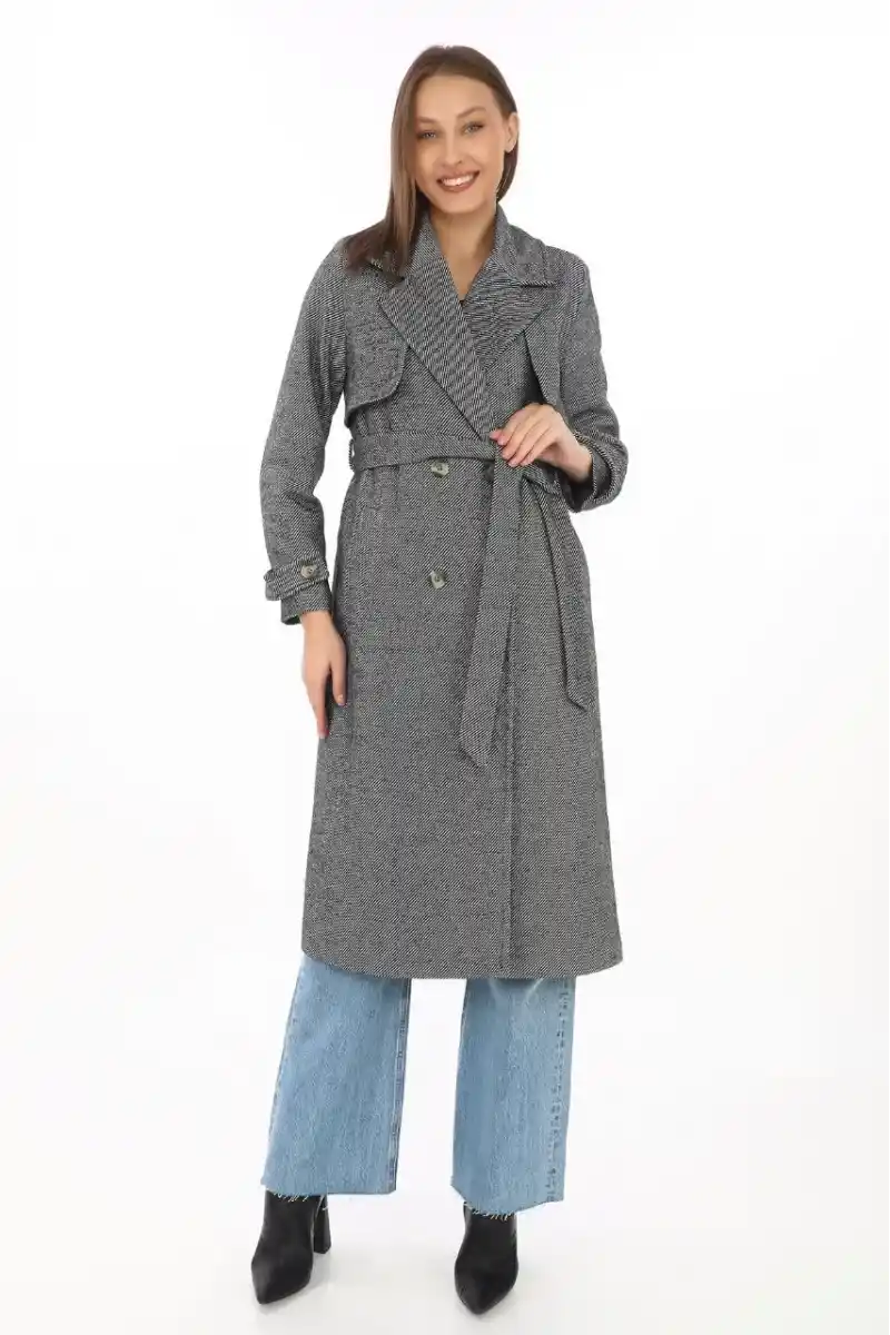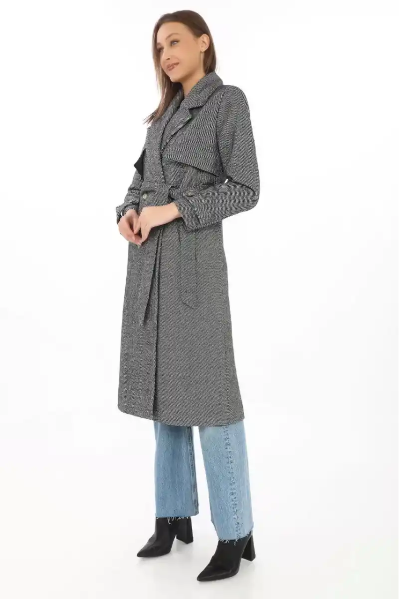 Kadın Balık Sırtı Kaşmir Uzun Kaşe Kaban - Boyalı Gri