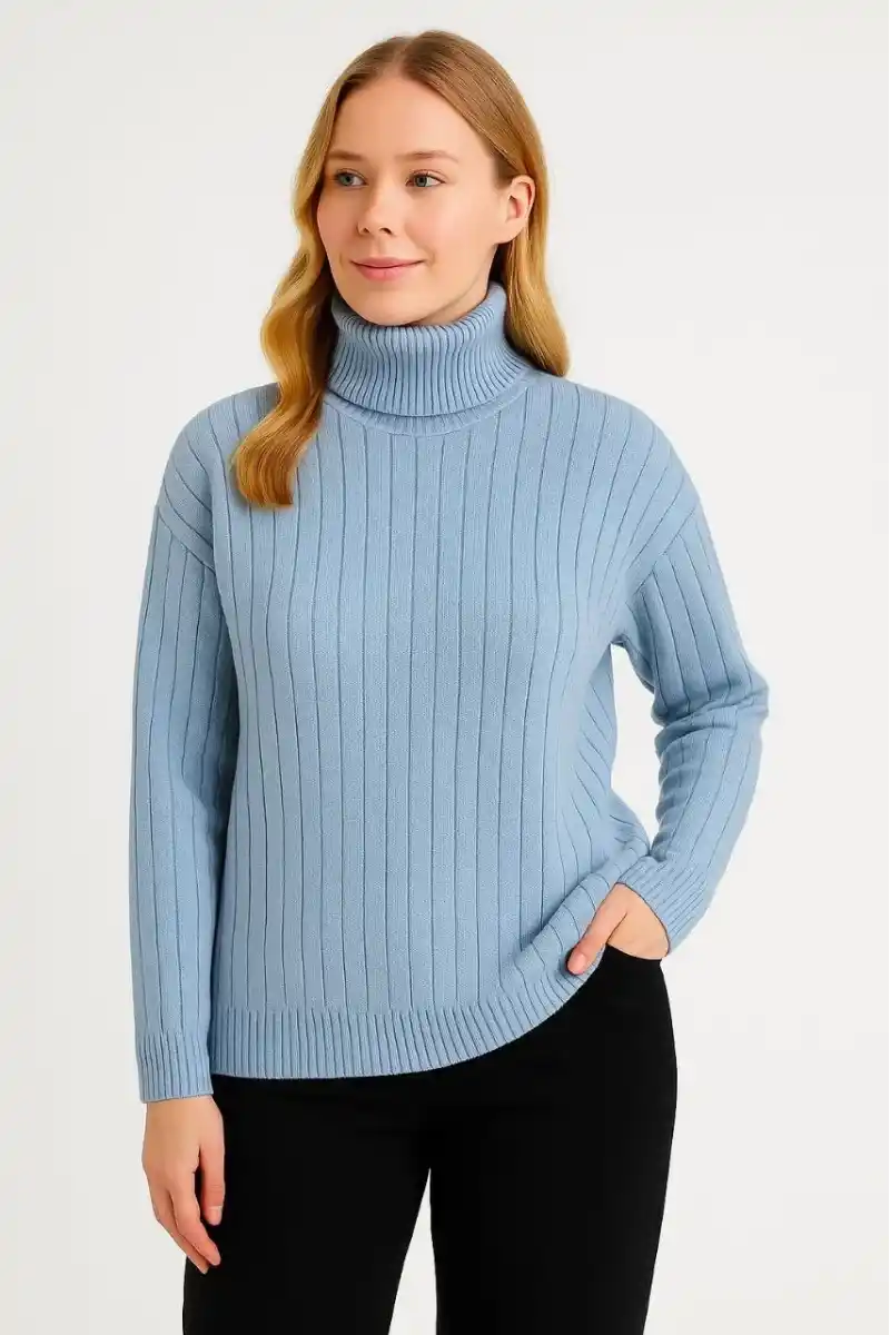 Kadın Balıkcı Yaka Bağazlı Triko Kazak Pamuklu Kalın Fitilli Dokuma - Bebek Mavisi