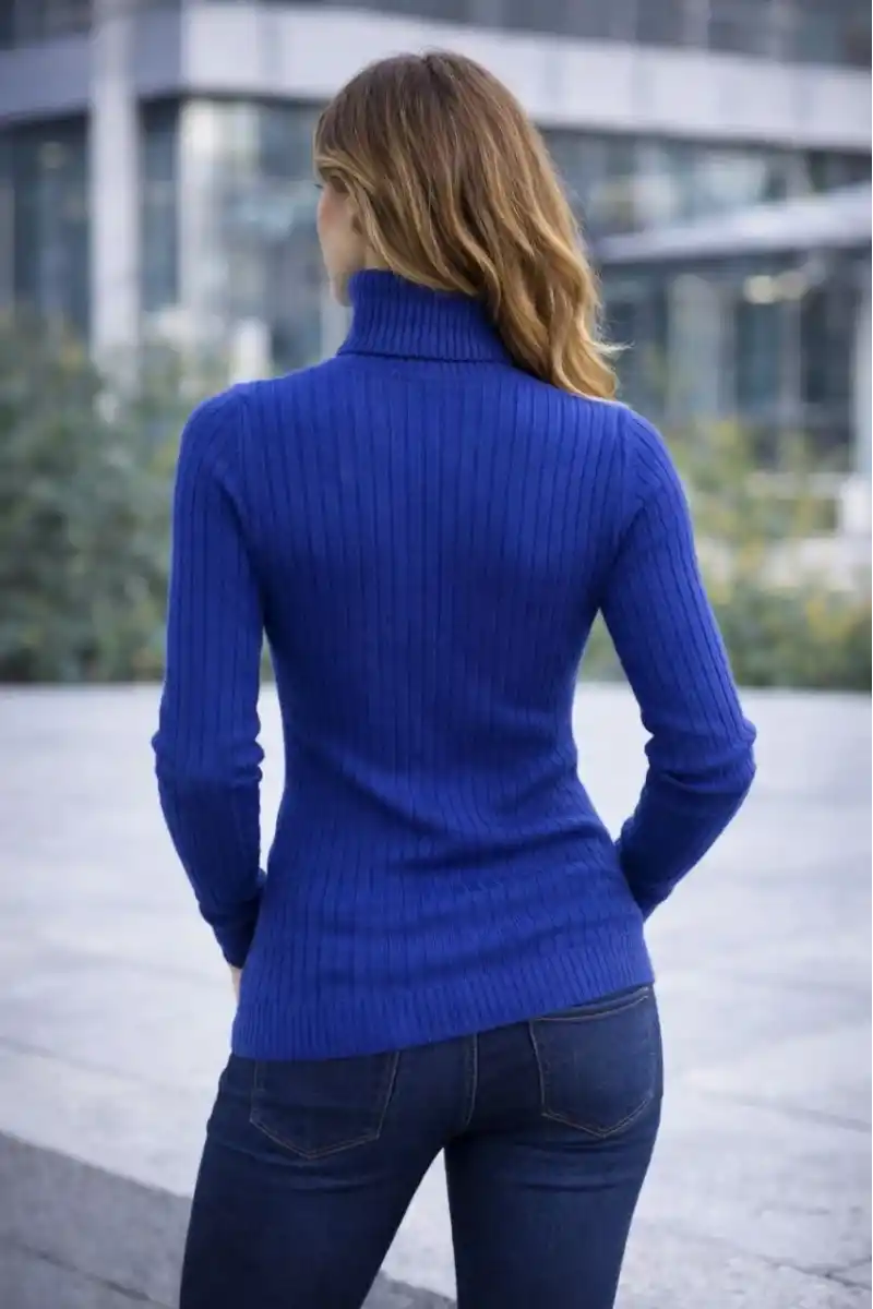 Kadın Balıkcı Yaka Bağazlı Triko Kazak Pamuklu Kalın Fitilli Dokuma - İndigo