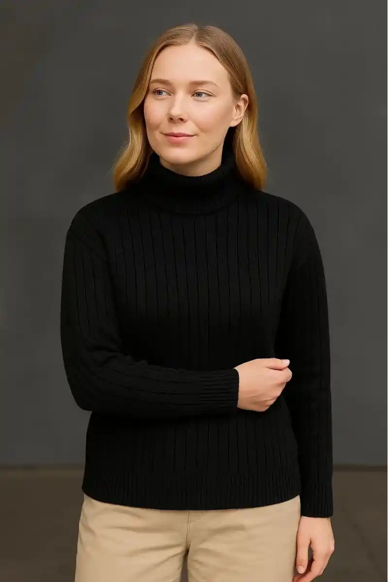 Kadın Balıkcı Yaka Bağazlı Triko Kazak Pamuklu Kalın Fitilli Dokuma - Siyah
