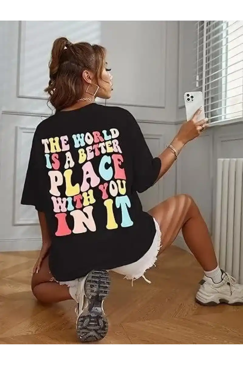 Kadın Bisiklet Yaka Baskılı T-shirt - Siyah