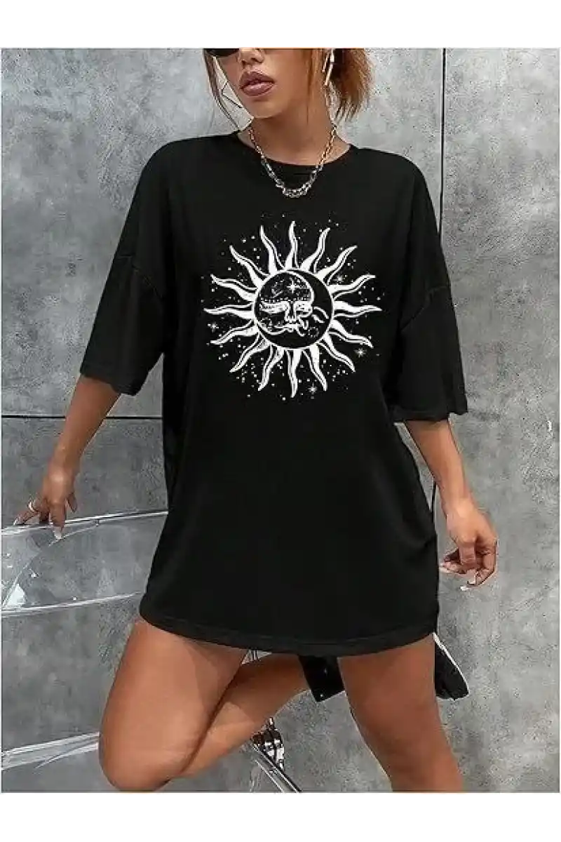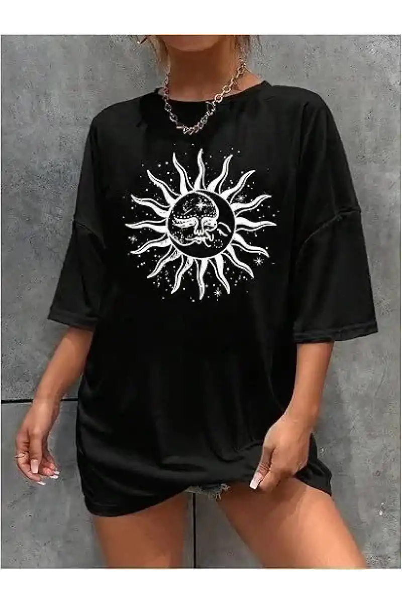 Kadın Bisiklet Yaka Baskılı T-shirt - Siyah