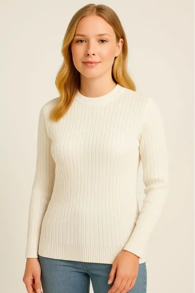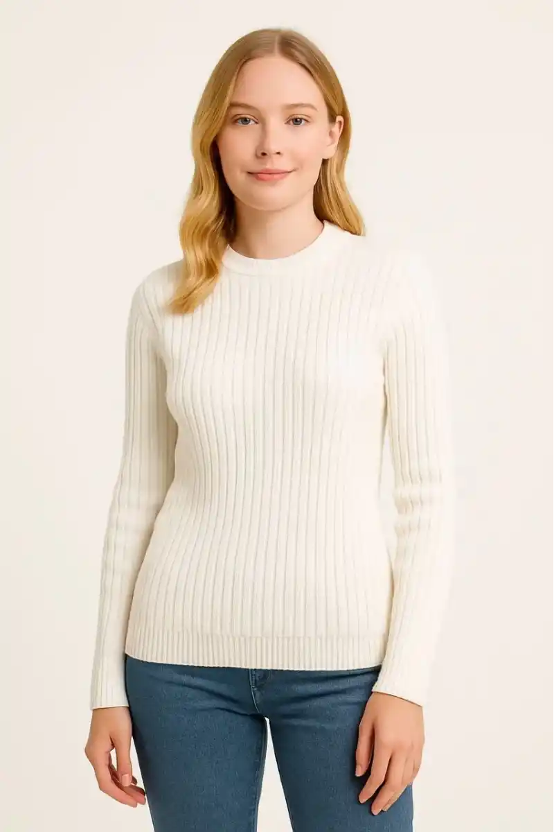 Kadın Bisiklet Yuvarlak Yaka Triko Kazak Pamuklu Kalın Fitilli Dokuma Regular Fit - Beyaz