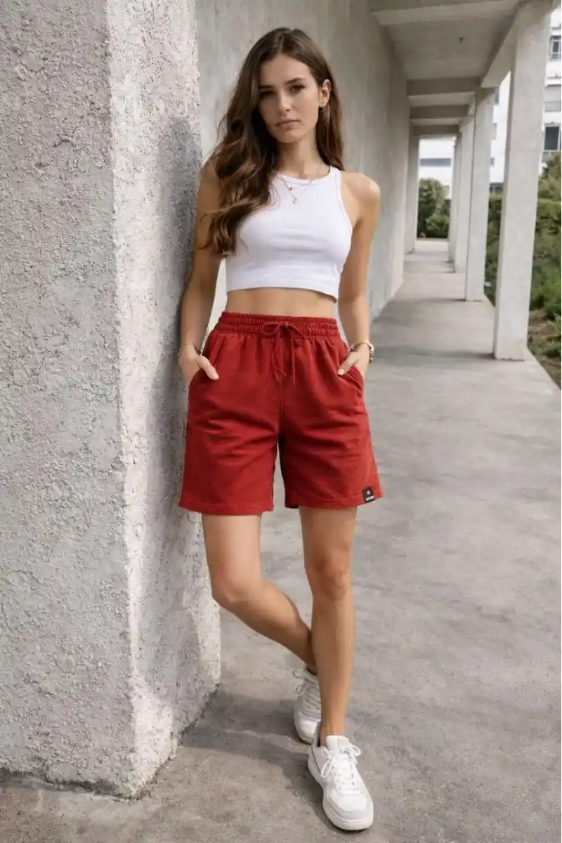 Kadın Dokuma otoban Şort Beli Lastikli Bağcıklı Cepli Kesim Şort - Turuncu