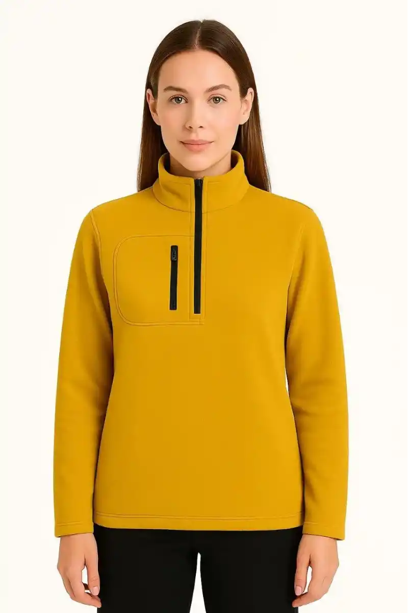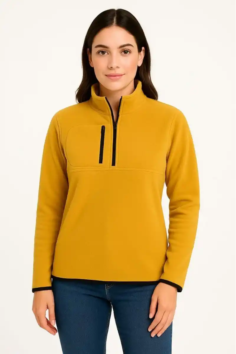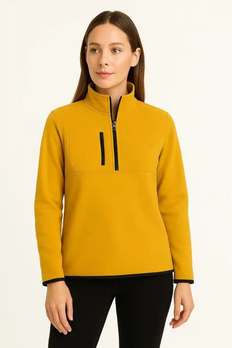 Kadın Polar Kazak – Dik Yaka, Yarım Fermuarlı, Fermuarlı Göğüs Cepli, Siyah Biyeli, Kışlık Rahat Regular Fit Günlük Model - Sarı