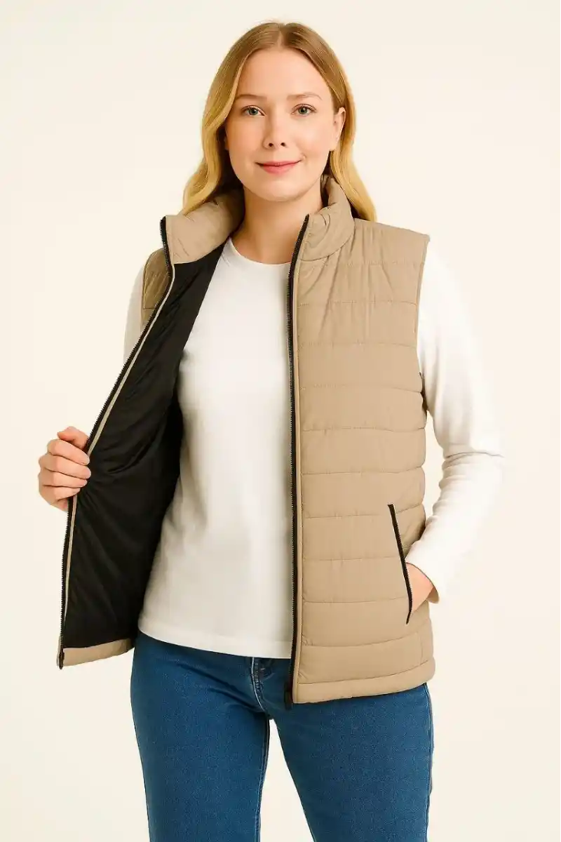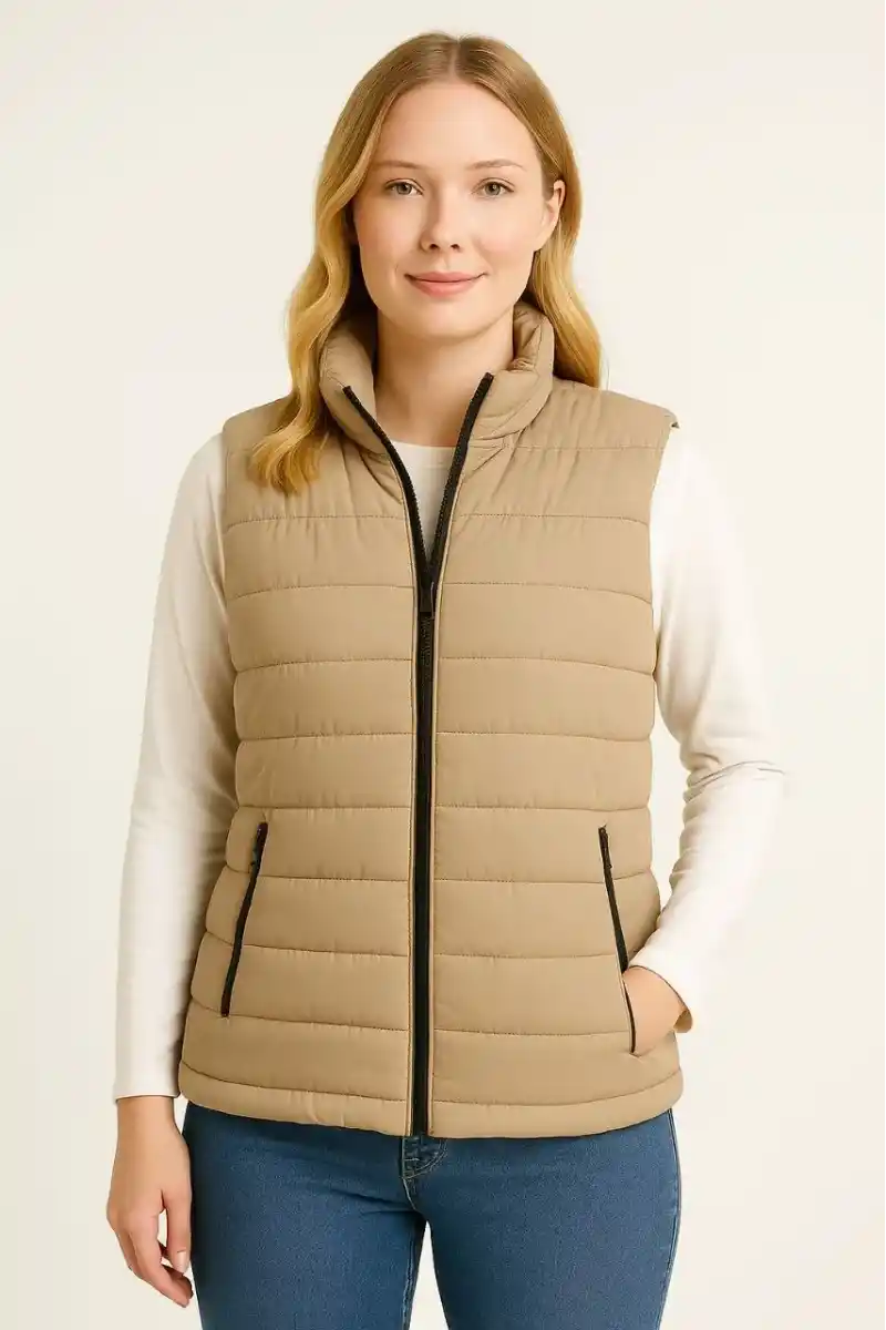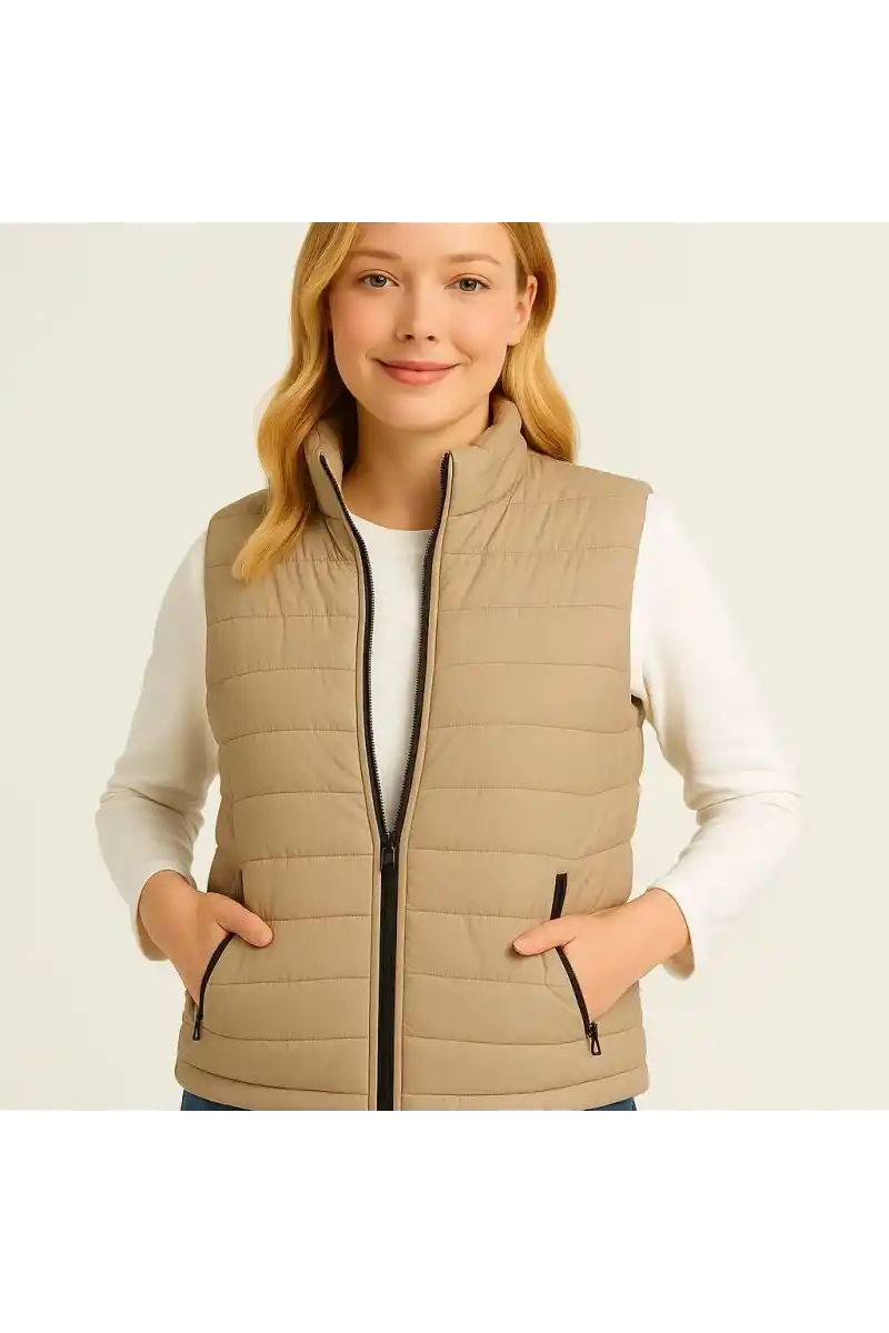 Kadın Şişme Fermuarlı Yelek Su itici Kapitone Astarlı Kumaş Cepli Hafif Kışlık Spor Rahat Kalıp - Bej