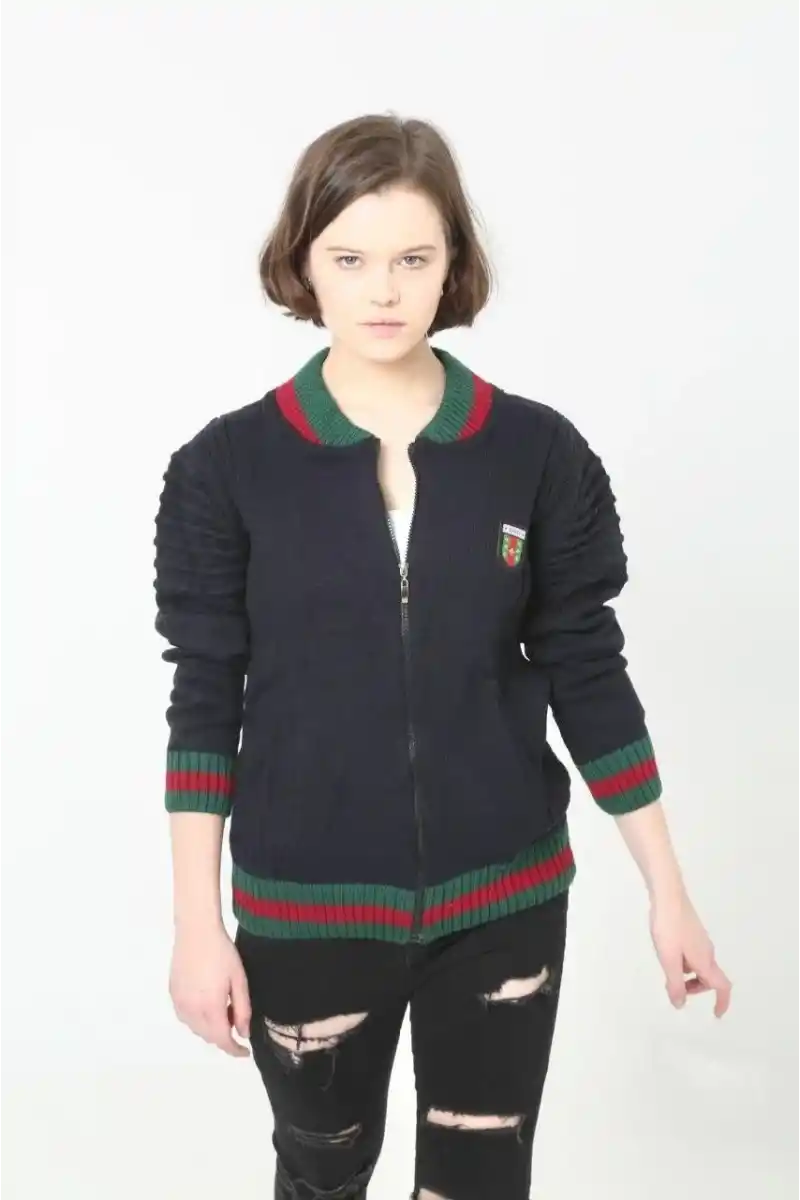 Kadın Tam Fermuarlı Triko Hırka - Lacivert