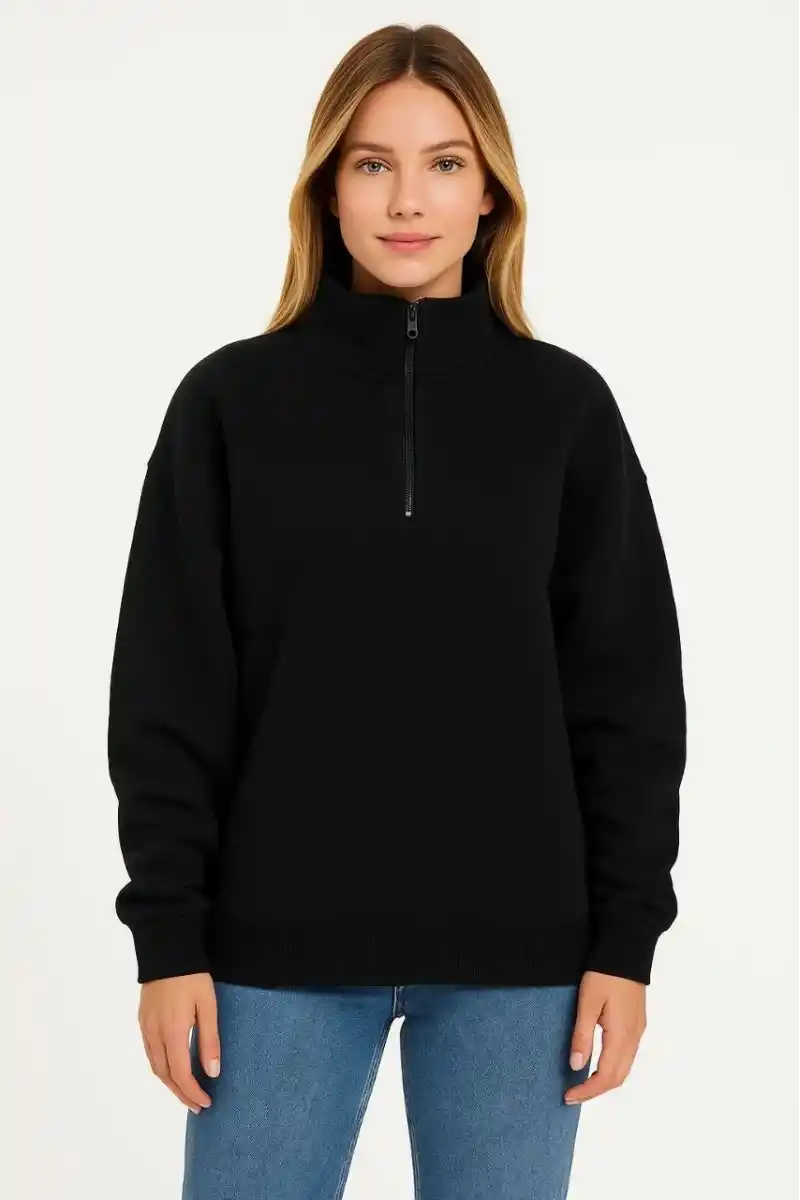 Kadın Üç İplik Dık Yaka Yarım Fermuarlı SweatShirt - Siyah