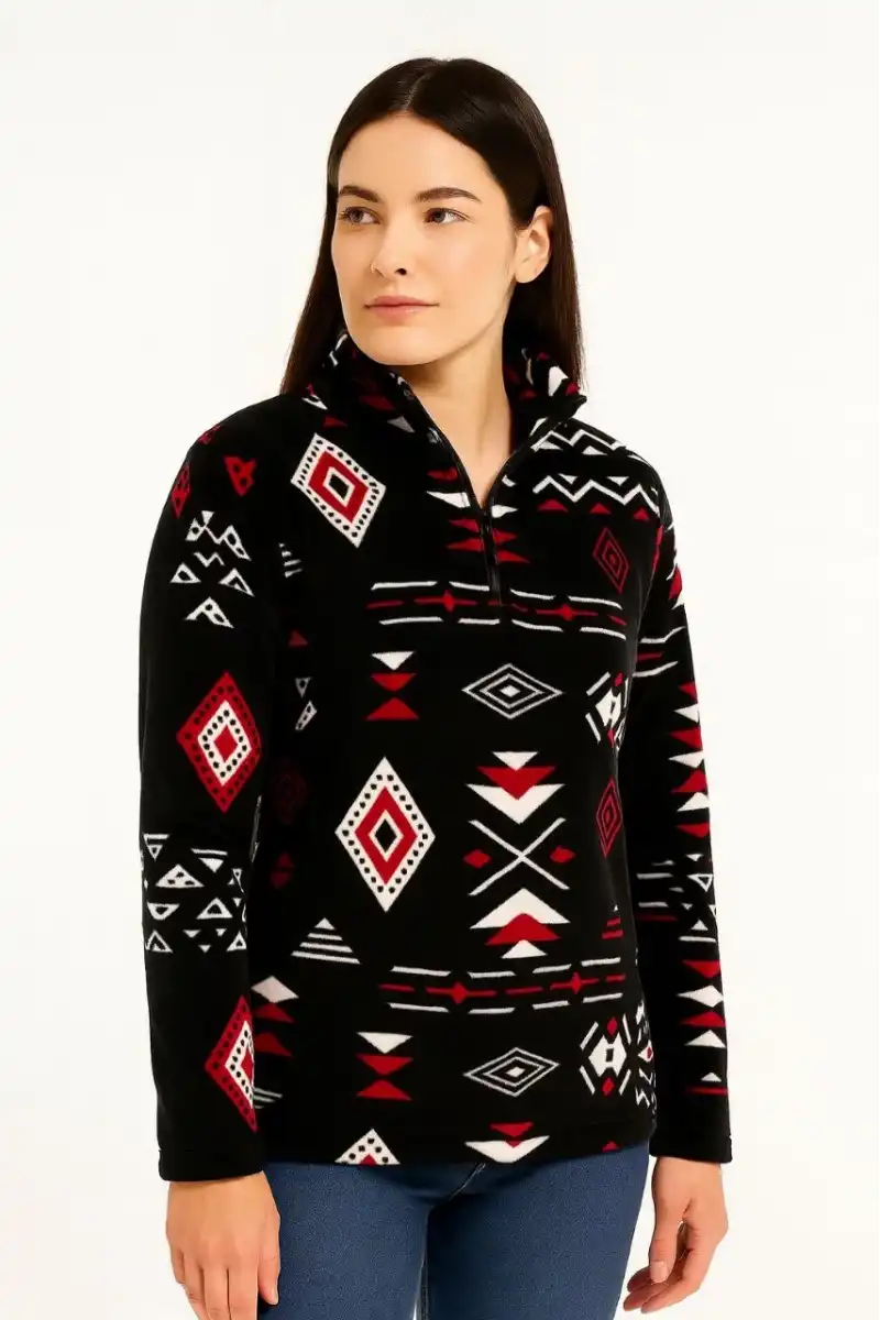 Kadın Yarım Fermuarlı Desenli Polar Sweat Tribal Etnik Desen Yakalı, Uzun Kollu, Oversize Rahat Kalıp - Siyah