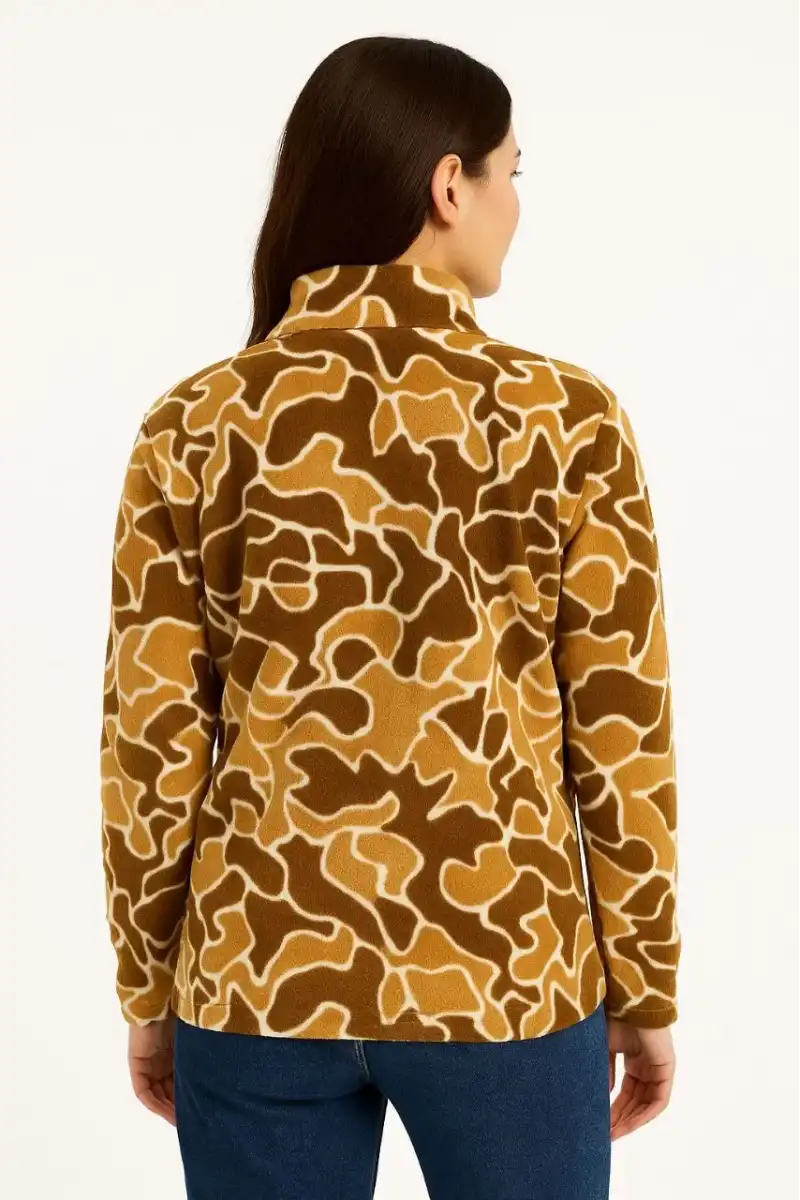 KADIN Yarım Fermuarlı Desenli Polar Sweat Yakalı, Uzun Kollu, Oversize Rahat Kalıp - Kahverengi