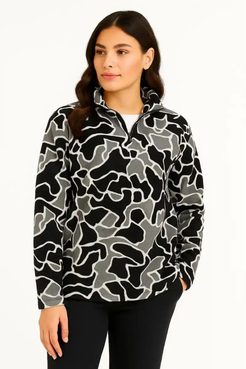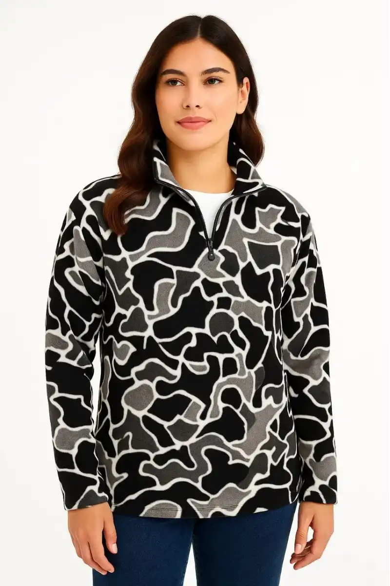 KADIN Yarım Fermuarlı Desenli Polar Sweat Yakalı, Uzun Kollu, Oversize Rahat Kalıp - Siyah