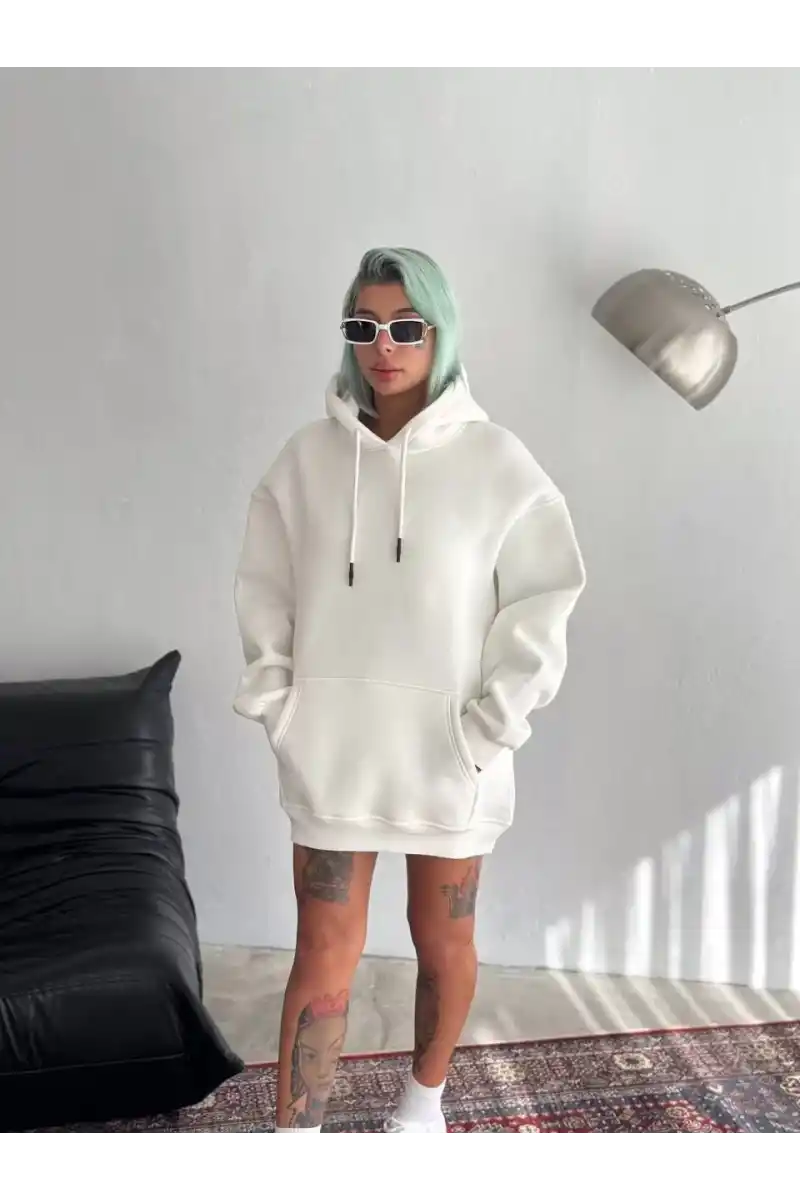 Kapüşonlu Üç İplik Penye Basic SweatShirt - Beyaz