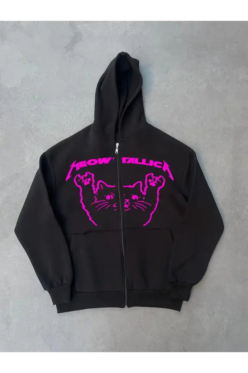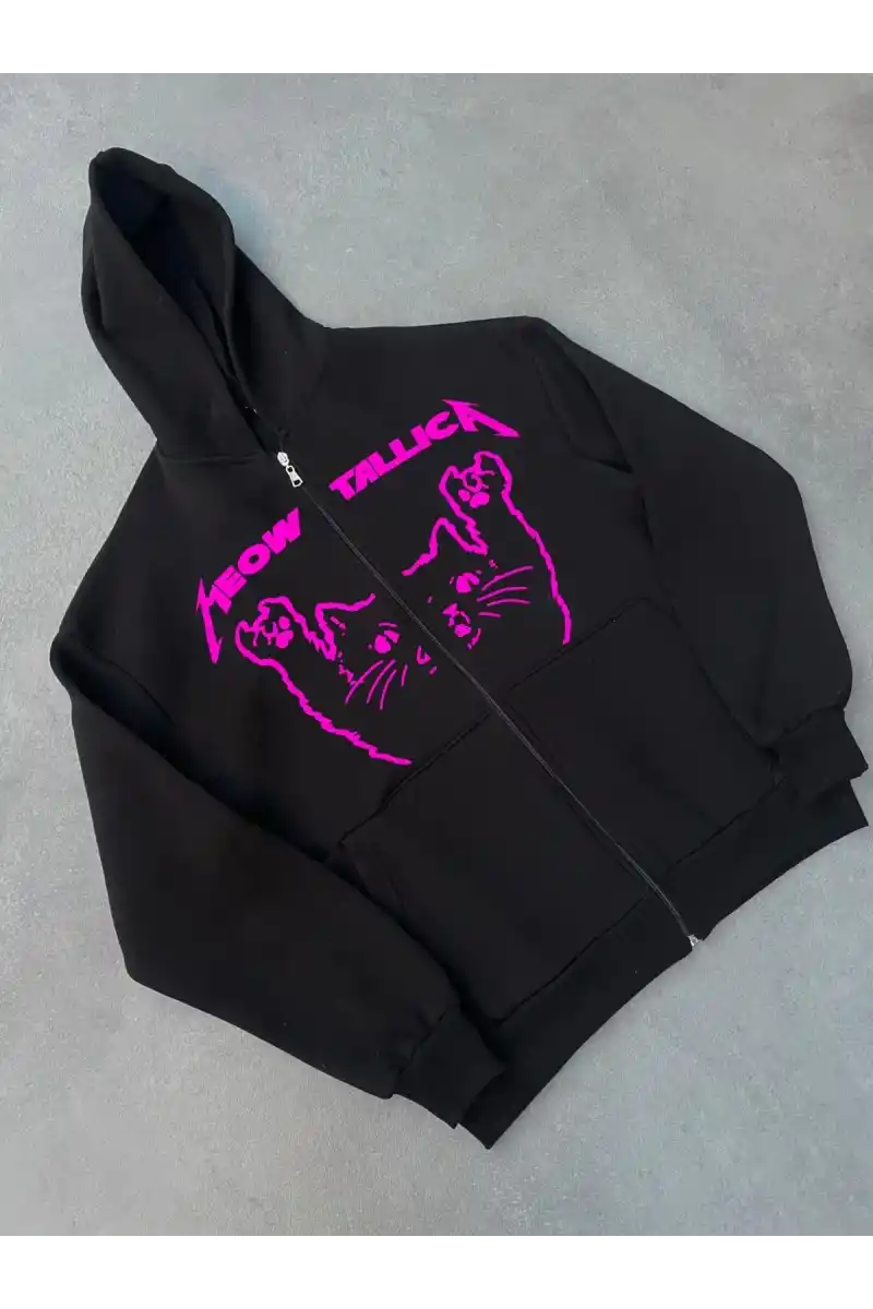 Kışlık Baskılı Fermuarlı Kapüşonlu Hırka - Siyah