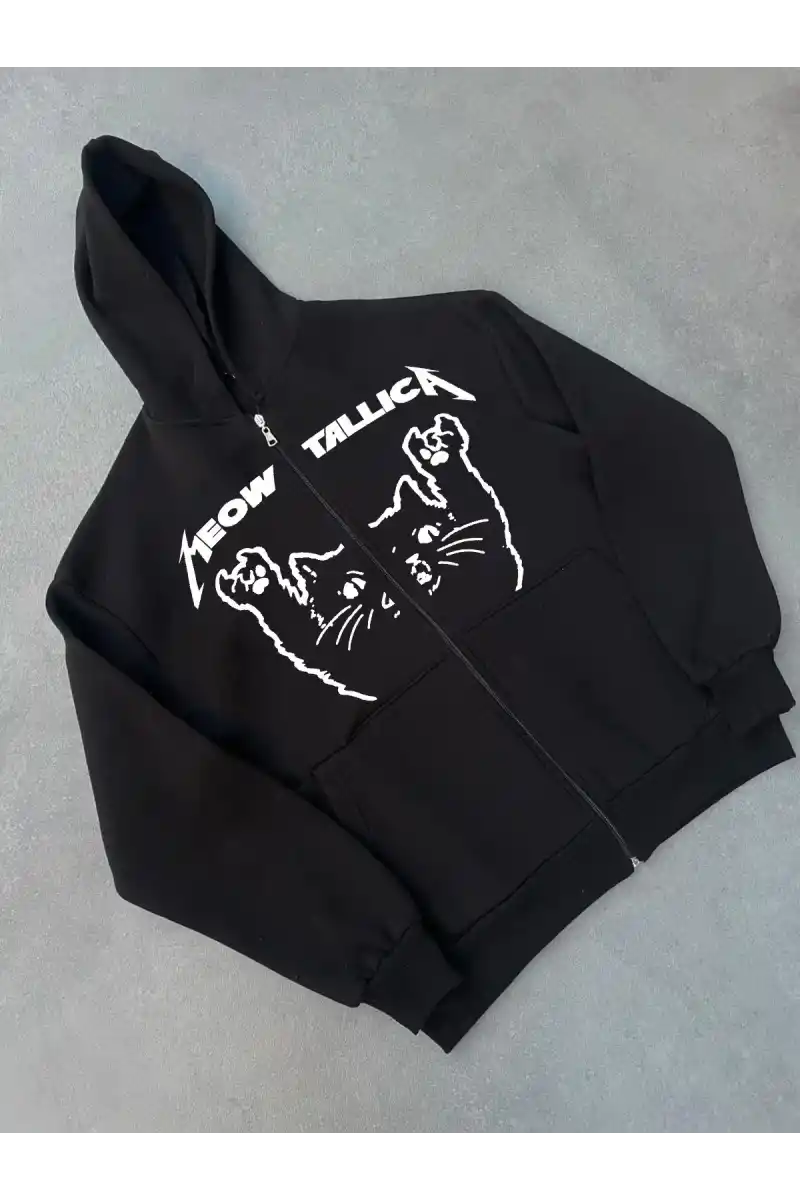 Kışlık Baskılı Fermuarlı Kapüşonlu Hırka - Siyah