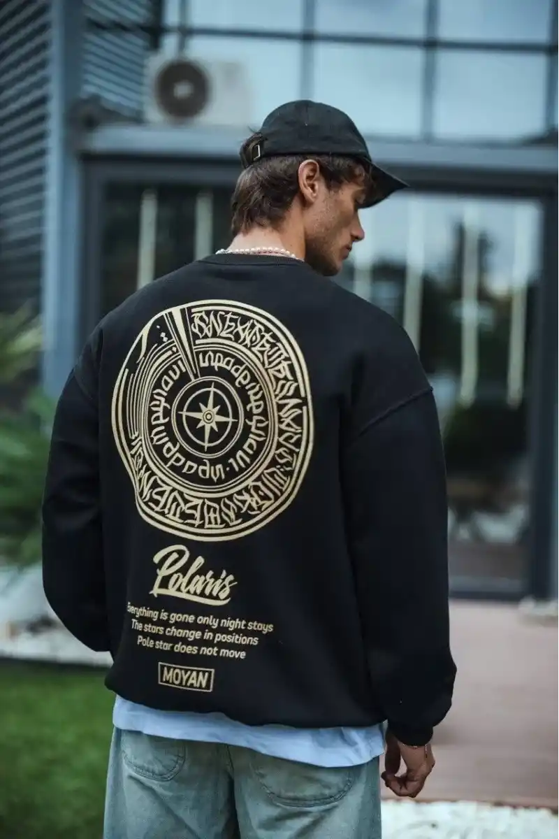 Kışlık Bisiklet Yaka Ön Ve Arka Baskılı SweatShirt - Siyah