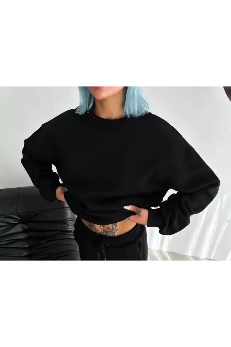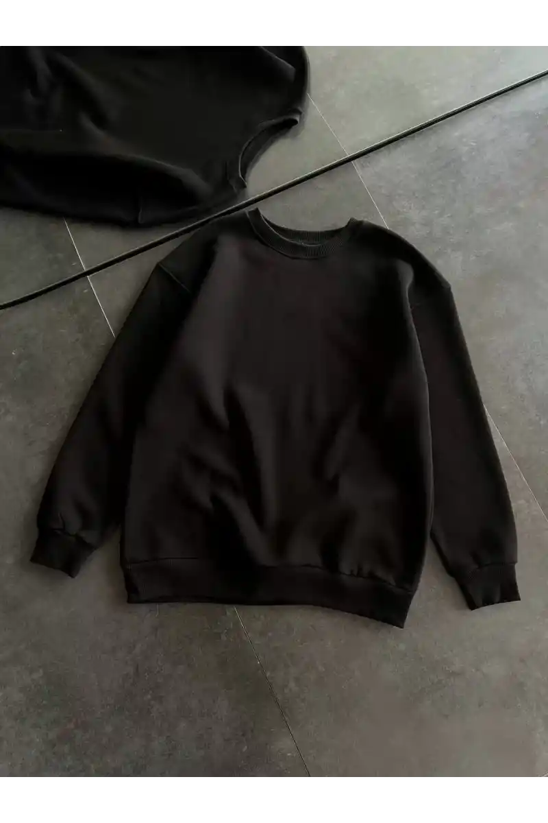 Kışlık Bisiklet Yaka Üç İplik Basic SweatShirt - Siyah