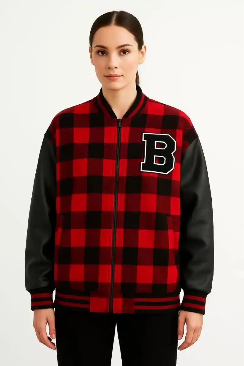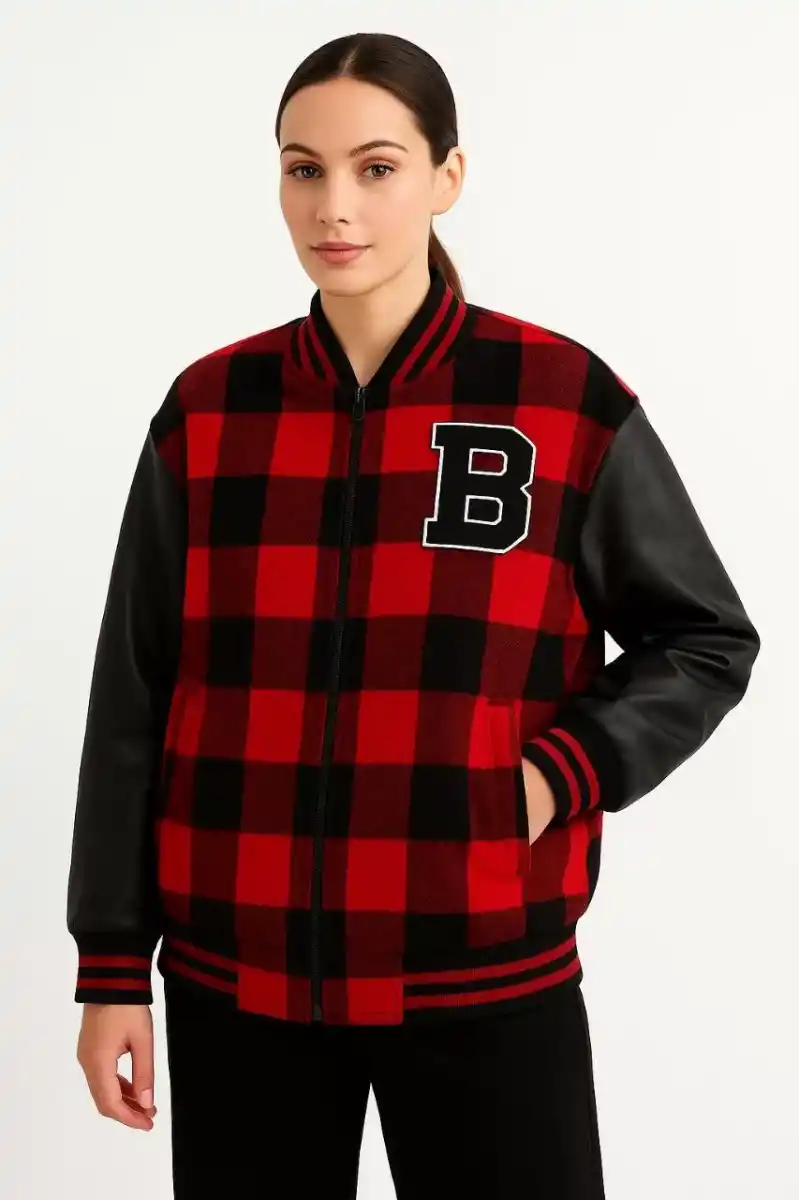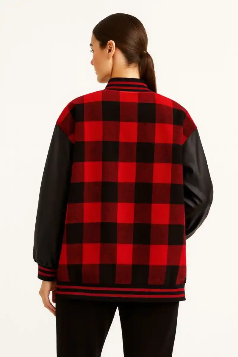 Kadın Kolej Ceket – Kareli Oduncu Kumaş, Kolları Suni Deri, Fermuarlı, İçi Kapitone Astarlı, Nakışlı Oversize Bahar & Kış Stil - Bordo