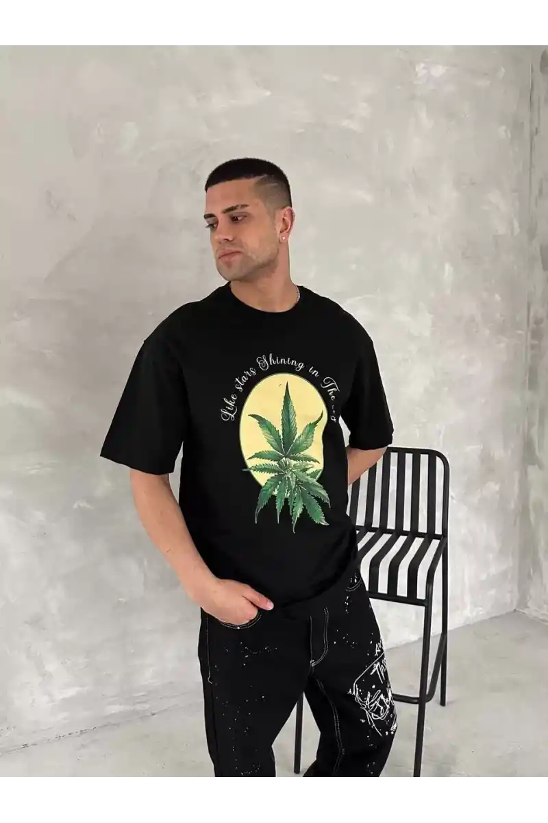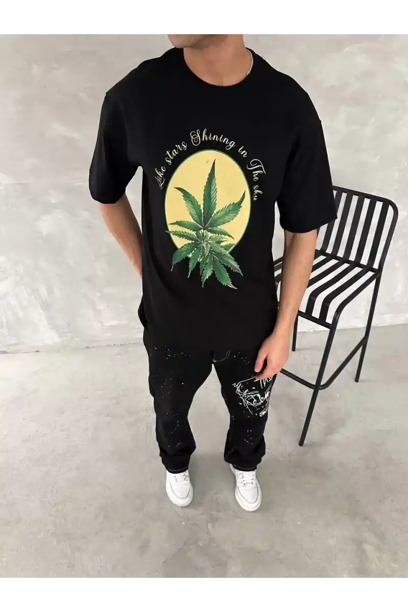 Ön ve Arka Baskılı Oversize Bisiklet Yaka T-shirt- Siyah