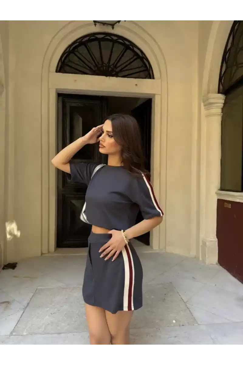Osy Modal yumuşak dokulu Kumaş Kadın Parçalı Bisiklet Yaka T-shirt Mini Şortlu Etek İkili Takım - Füme