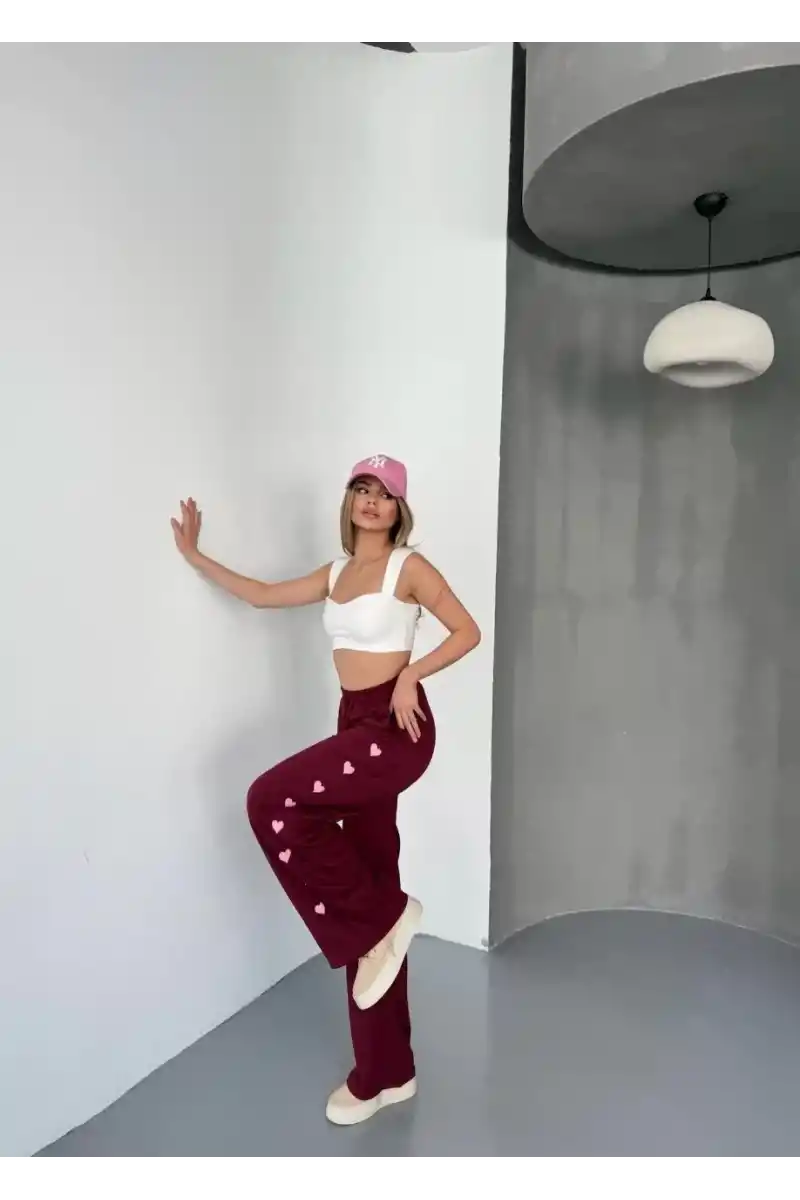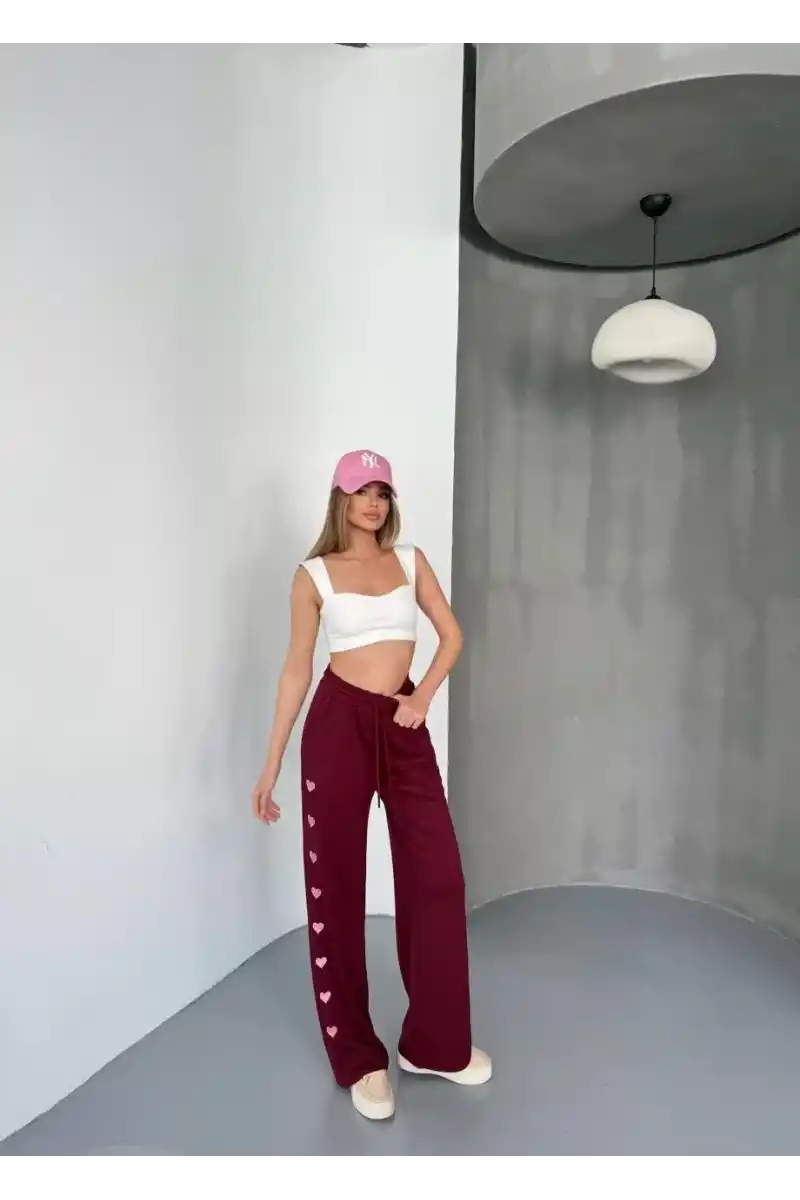 Osy Modal Yumuşak Dokulu Kumaş Nakış işlemeli Rahat Bol Paça Eşofman Pantalon - Bordo