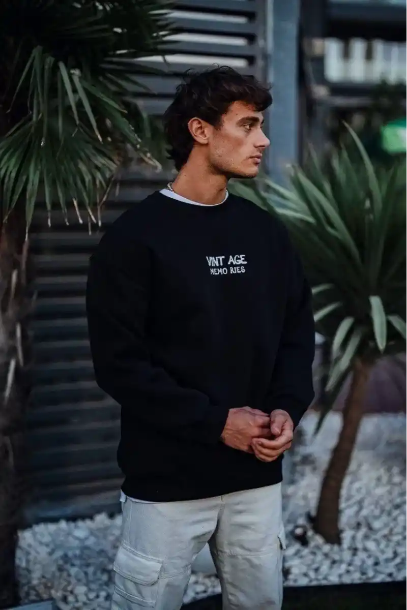 Oversize Bisiklet Yaka Üç İplik Baskılı SweatShirt - Siyah