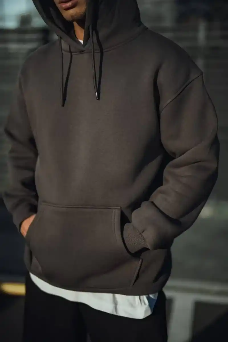 Üç İplik Penye Kapşonlu Basic SweatShirt - Füme
