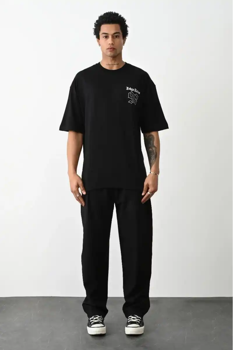 Unisex Baskılı Oversize T-Shirt - Siyah