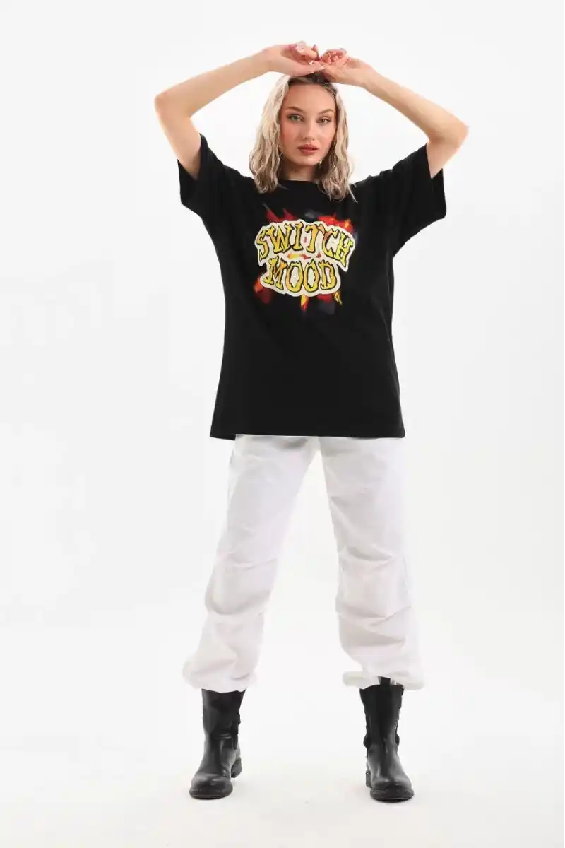 Unisex Baskılı Oversize T-Shirt - Siyah