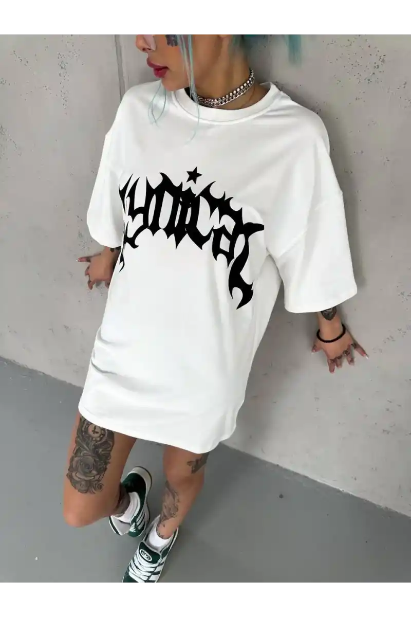 kadın Bisiklet Yaka Baskılı Oversize T-Shirt - Beyaz