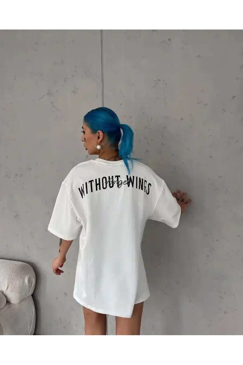 kadın Bisiklet Yaka Baskılı Oversize T-Shirt - Beyaz