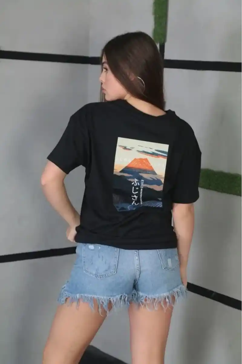 Kadın Bisiklet Yaka Baskılı Oversize T-Shirt - Siyah