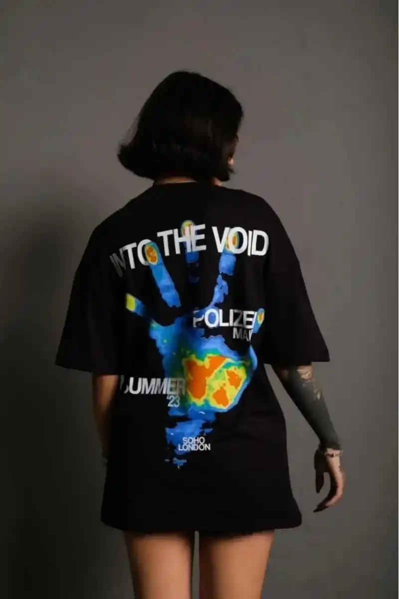 kadın Bisiklet Yaka Baskılı Oversize T-Shirt - Siyah