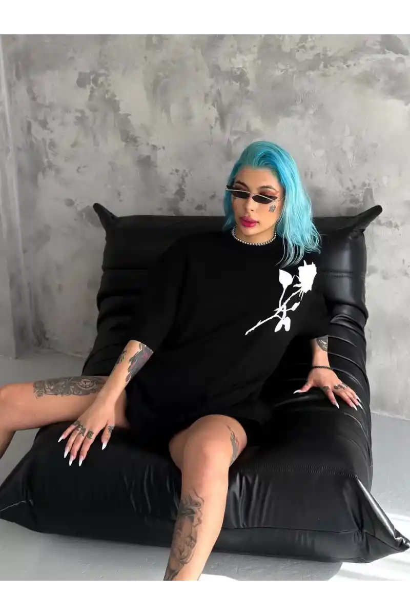 Unisex Bisiklet Yaka Baskılı Oversize T-Shirt - Siyah