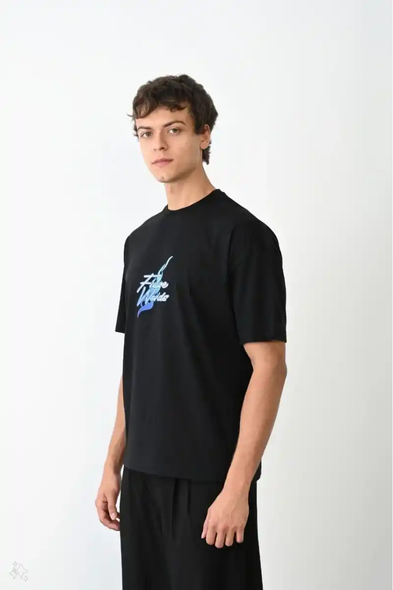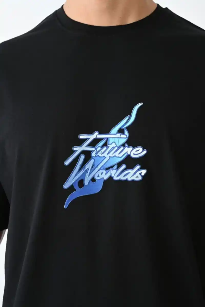 ERKEK Bisiklet Yaka Baskılı Oversize T-Shirt - Siyah