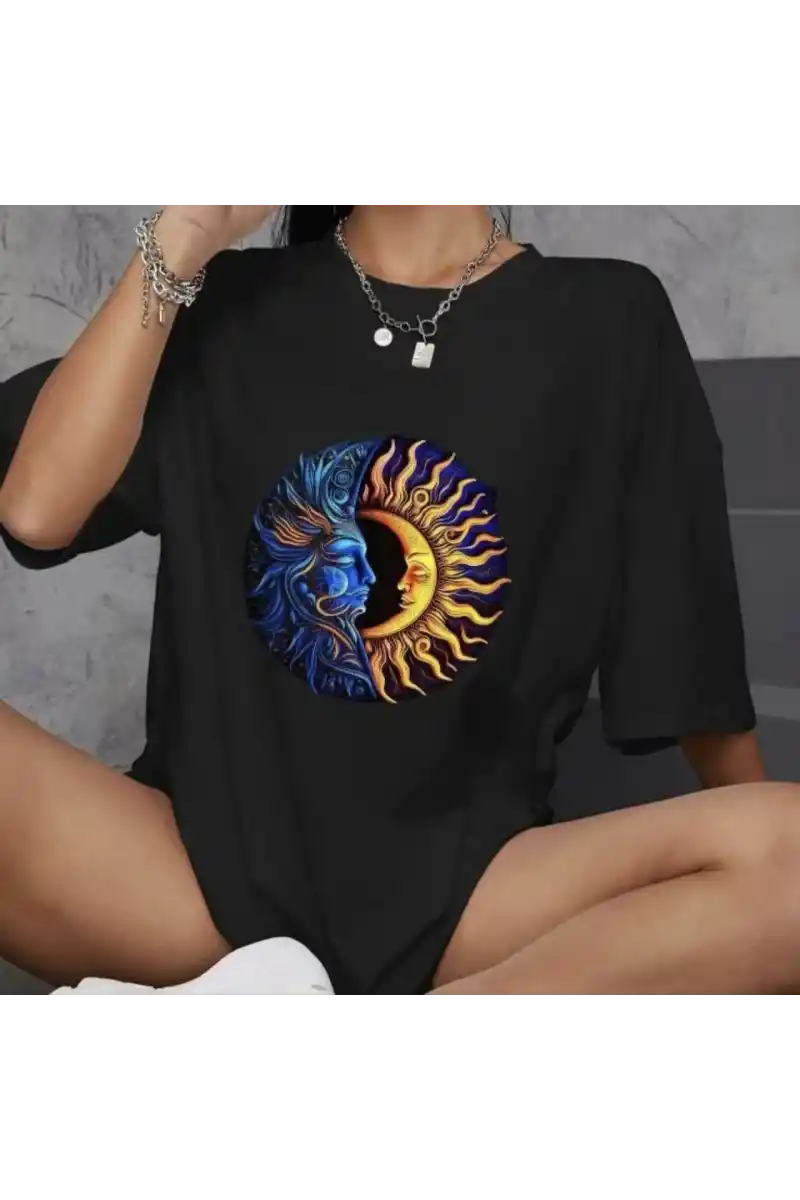 kadın Bisiklet Yaka Baskılı Oversize T-Shirt - Siyah